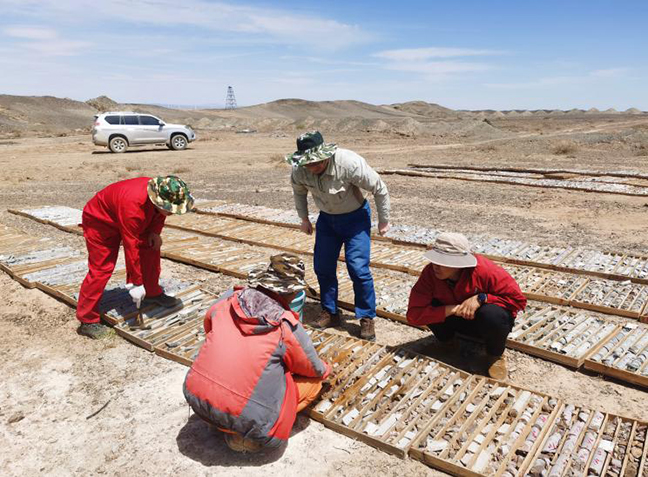 新疆鑫匯公司的野馬泉西金礦項目工作區(qū)距離哈密市155公里,工期為6-10月,需完成6千米的鉆探工作任務(wù)、16平方公里的地質(zhì)剖面等。礦區(qū)內(nèi)山丘連綿不絕,自7月開始,每天下午礦區(qū)地面溫度均超過普通溫度計的最高刻度,屬于“爆表”狀態(tài)。因工作任務(wù)緊,地質(zhì)隊員們每天早上7點出發(fā),中午之前要返回基地,傍晚重新出發(fā),22點前趕回基地,開展剖面測量和鉆探編錄工作,以避開正午的酷熱。為了不被灼傷,地質(zhì)隊員和鉆探工人把自己包裹得嚴(yán)嚴(yán)實實,手拎地質(zhì)錘敲下每一個礦化線索,身背樣品包裝載好沉甸甸的希望。汗水浸濕衣衫,腳底磨出老繭,他們踏遍了礦區(qū)的角角落落,最終繪制出整個礦區(qū)的礦化藍圖。