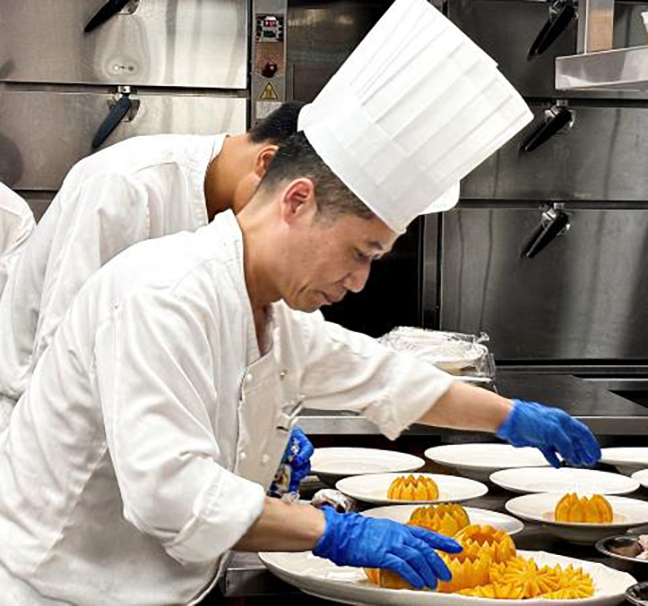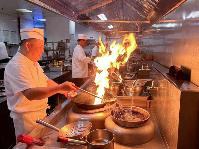 在鹽城迎賓館、國投大酒店、鹽城萬豪酒店,后廚內(nèi)各類蒸煮設(shè)備持續(xù)釋放出熱氣。為了客人味蕾的享受,在高達四五十?dāng)z氏度的廚房里,廚師們在灶臺前忙活,耐心細致地烹飪著每一道菜肴,洗鍋、倒油、下主料、添配菜,他們一手端著鐵鍋,一手用力翻炒,炙熱的火焰不時從鍋中竄出。對于廚師來說,每年7月到9月都是一場漫長的考驗,由于大部分后廚油煙大,不適合安裝空調(diào),用大功率風(fēng)扇又會影響烹飪,所以廚師們的工作服幾乎都是濕的,而正是因為有了他們在高溫下的執(zhí)著堅守,才有了滿足人們味蕾的美味菜肴。