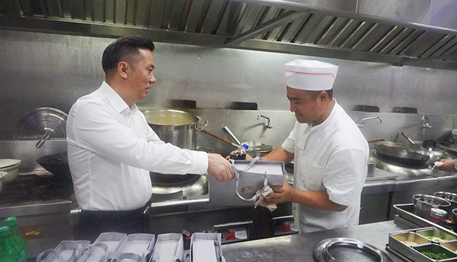 活動中,國投大酒店負(fù)責(zé)人帶領(lǐng)經(jīng)理層成員,為堅(jiān)守在高溫一線的職工送上了清涼解暑慰問品,并叮囑他們要注意勞逸結(jié)合、做好自我防護(hù)。隨后,酒店負(fù)責(zé)人詳細(xì)了解各一線崗位的防暑降溫措施、人員排班等情況,要求相關(guān)負(fù)責(zé)同志堅(jiān)決守牢安全底線,合理安排作業(yè)時(shí)間,普及好防暑降溫和急救知識,切實(shí)做好高溫時(shí)節(jié)各項(xiàng)工作,確保職工的健康和安全。