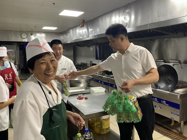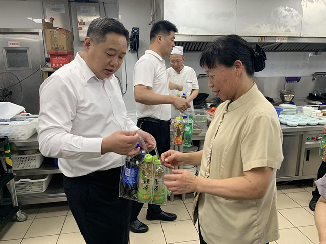 劉晉國(guó)一行為堅(jiān)守在高溫一線的職工們送上慰問品,并察看了酒店餐飲接待服務(wù)、廚房菜肴出品、工程施工作業(yè)和康體中心安全管理等方面工作情況。每到一處,劉晉國(guó)都同一線職工親切交談,詳細(xì)了解防暑降溫和日常工作情況,對(duì)他們的愛崗敬業(yè)精神表示充分肯定,反復(fù)叮囑大家要注意勞逸結(jié)合、加強(qiáng)自我防護(hù),同時(shí)要求各部門積極創(chuàng)造條件,改善工作環(huán)境,把防暑降溫工作做細(xì)做實(shí)做到位,不斷提升職工的獲得感、幸福感和歸屬感。