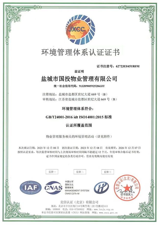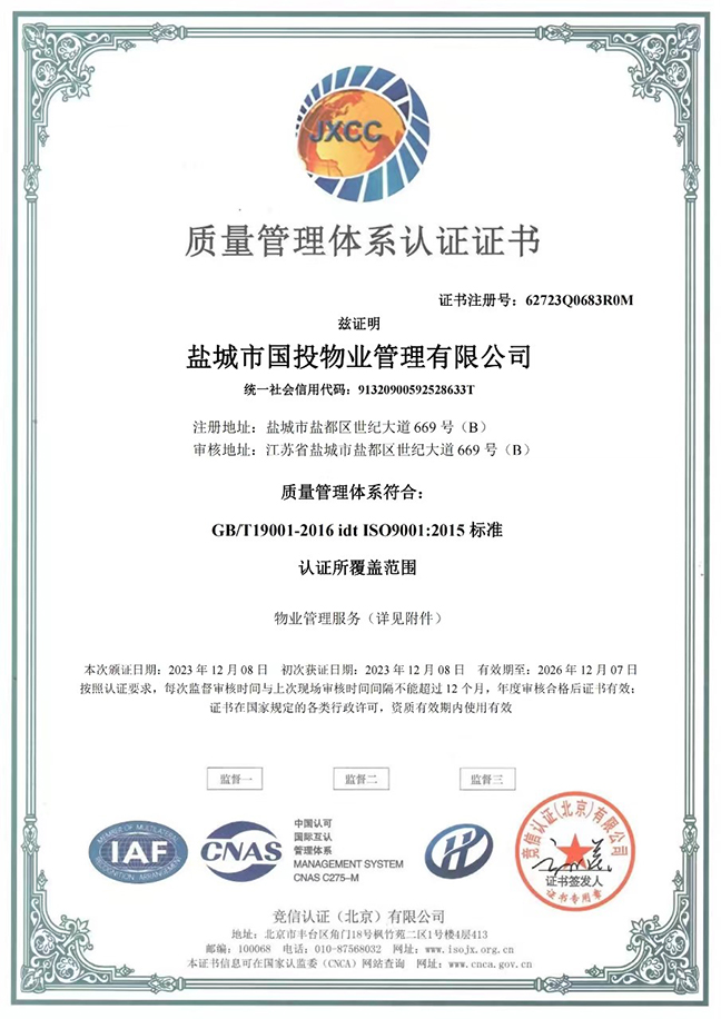 日前,鹽城國(guó)投物業(yè)公司順利取得ISO“三體系”(ISO9001質(zhì)量管理體系、ISO14001環(huán)境管理體系、ISO45001職業(yè)健康安全管理體系)認(rèn)證證書。這是公司在提升企業(yè)綜合實(shí)力過(guò)程中取得的新進(jìn)展,標(biāo)志著公司在精細(xì)化、制度化、規(guī)范化管理方面邁上新臺(tái)階。