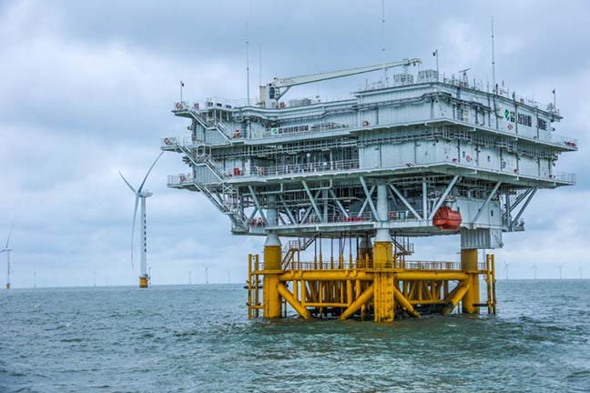 國能大豐H5#海上風(fēng)電場項目由32臺GW184-6.45MW智能海上風(fēng)電機(jī)組構(gòu)成,坐落于大豐港水域港界之外,太平沙北側(cè),輻射沙洲北端,其場區(qū)中心距離海岸約67公里。