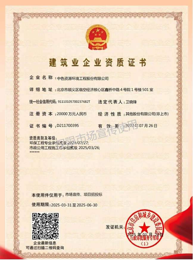 近日,集團資源板塊傳來捷報,經北京市住房和城鄉(xiāng)建設委員會審核批準,中色環(huán)境公司成功獲批“市政公用工程施工總承包貳級資質”證書,這一成果標志著公司綜合實力的進一步提升,對業(yè)務拓展、品牌提升及戰(zhàn)略布局有著極為深遠的影響。