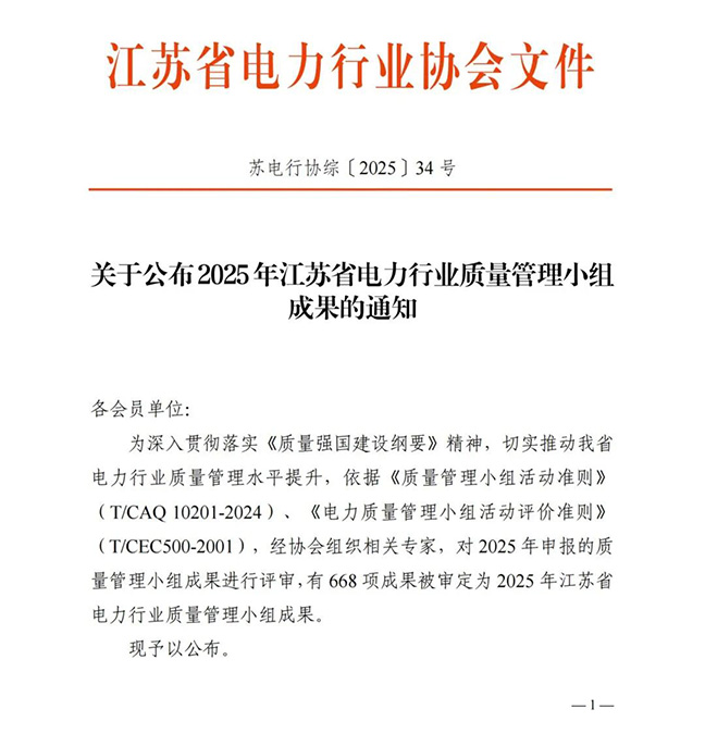 近年來(lái),國(guó)豐公司在質(zhì)量管理領(lǐng)域收獲頗豐,榮獲江蘇電力行業(yè)質(zhì)量管理優(yōu)秀成果: