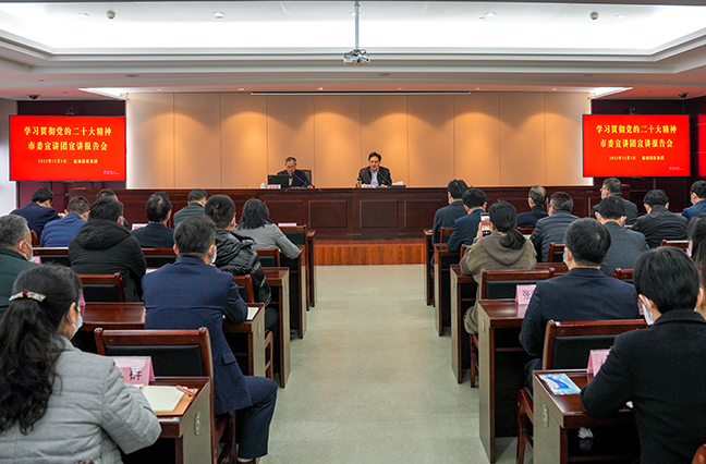為深入學(xué)習(xí)貫徹黨的二十大精神,扎實(shí)推動(dòng)黨的二十大精神入腦入心、走深走實(shí),根據(jù)市委統(tǒng)一部署,12月3日上午,學(xué)習(xí)貫徹黨的二十大精神市委宣講團(tuán)宣講報(bào)告會(huì)在鹽城國(guó)投集團(tuán)舉行。市委宣講團(tuán)成員、鹽城工學(xué)院黨委常委、宣傳部部長(zhǎng)奚新國(guó)作宣講報(bào)告。集團(tuán)黨委書(shū)記、董事長(zhǎng)張林海主持報(bào)告會(huì)并講話(huà)。集團(tuán)黨委班子成員,市委派駐集團(tuán)黨建工作指導(dǎo)員陳中才,集團(tuán)中層以上干部參加報(bào)告會(huì)。